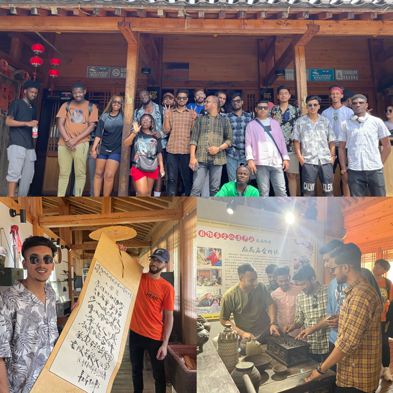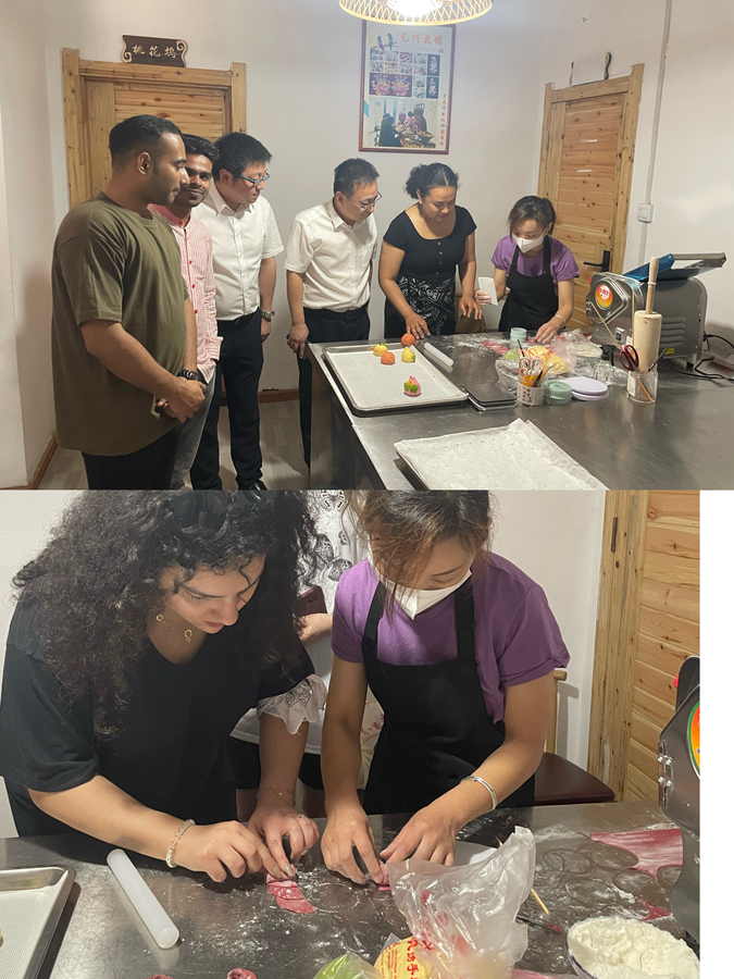 在郧西县天河双石沟民俗村,穿过依山傍水、天然形成的村落建筑,外籍师生一同参观中国民间手工面塑--乞巧花馍,花馍造型生动夸张,制作精巧细腻,在民间有1000多年的历史,外籍师生被花馍的精巧图案和工艺所吸引,纷纷前往品尝并尝试亲手制作。随后欣赏了中式婚礼十里红妆表演,留学生们对这种传统婚礼形式充满好奇,与迎亲队伍同贺共舞,置身其中感受中国传统文化的魅力。走进天河农耕民俗博物馆,映入外籍师生眼帘的是代表着时代变迁缩影的农耕文化、生活长廊、婚俗文化、七夕文化等展区,这些手工艺品和农耕老物件也是天河两岸乡土生活的轨迹,彷佛将新时代国际青年们带回纯粹、勤劳的农耕时代。