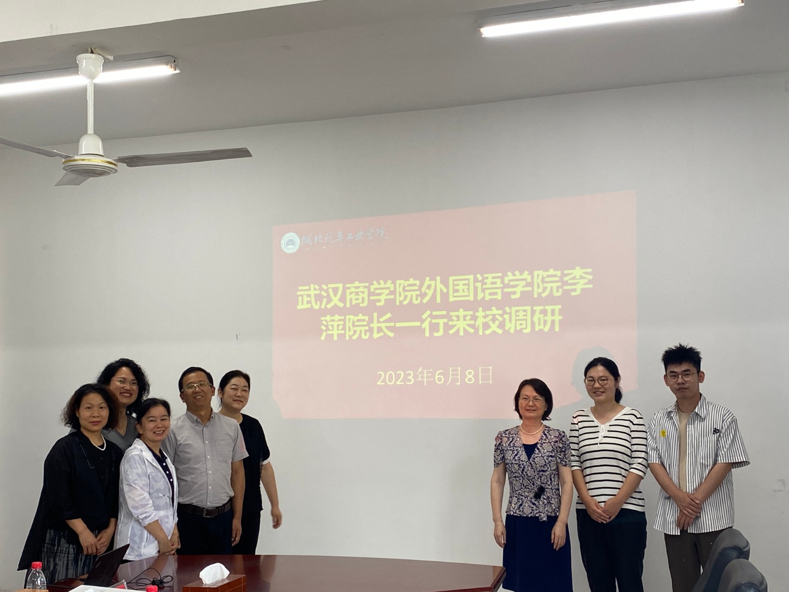 本网讯(文 王若男/图 王若男、段艳菊)6月8日上午,武汉商学院外国语学院院长李萍、日语系主任吴惠升、日语系教师蔡一升一行三人来我校外国语学院开展专题工作调研。外国语学院副院长王辰晖、副院长翟全伟和专业负责人等7名教师在第三教学楼3503会议室与调研组进行了专题交流座谈。