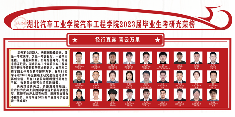 本网讯(文/甘甜)近日,从汽车工程学院传来喜讯,该学院64名19级同学顺利考取硕士研究生,其中多名同学分别被华南理工大学、大连理工大学、中国农业大学、西南交通大学、武汉理工大学等985、211院校录取,部分专业班级双一流高校录取率达50%,学院整体考研录取率达到23.88%,再创佳绩。
