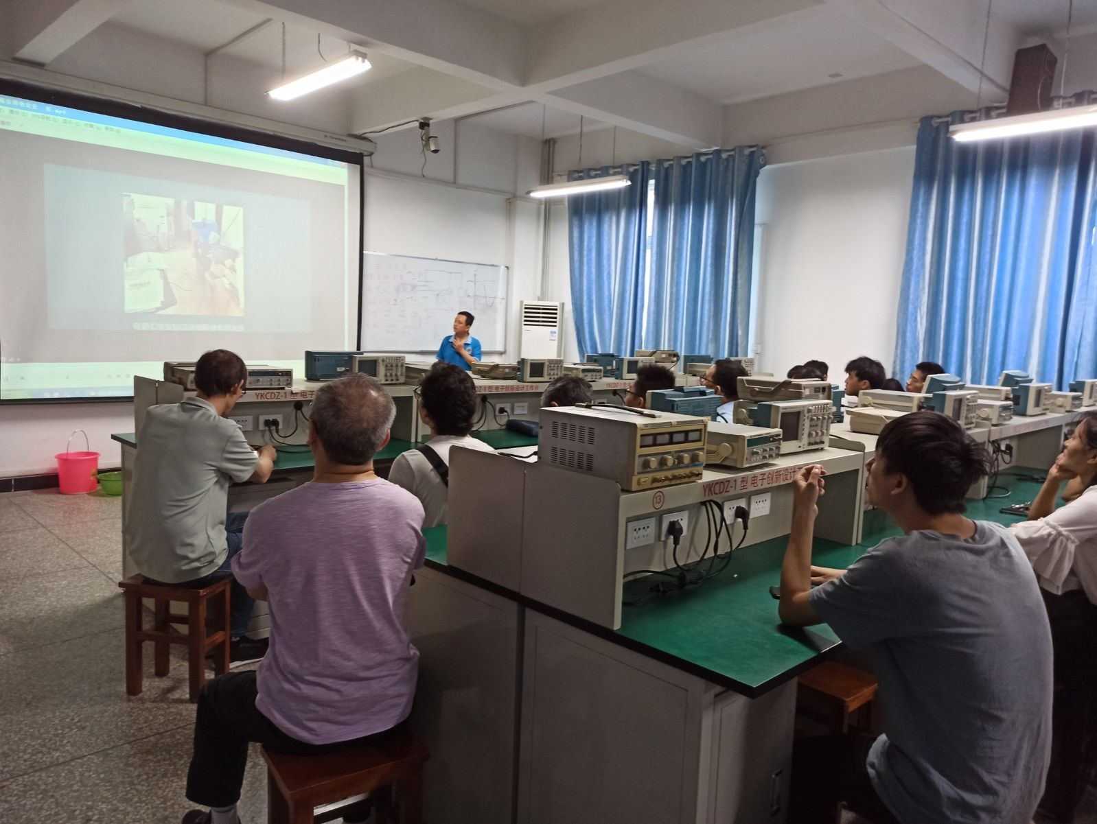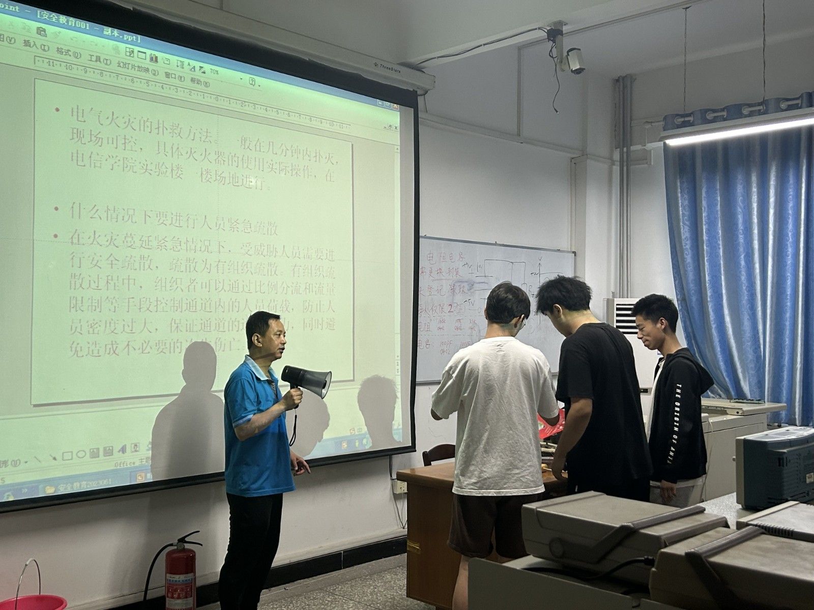 第二阶段在实验室开展应急处置知识与方法培训。在电工电子实验教学示范中心,杨毅老师讲解了电气/电子类实验室安全操作注意事项、主要危险源、可能发生的安全风险、安全防护保护措施、安全应急处置措施等,现场还模拟演练了电气仪器设备(电池)起火燃烧的初期火灾应急处置等环节。
