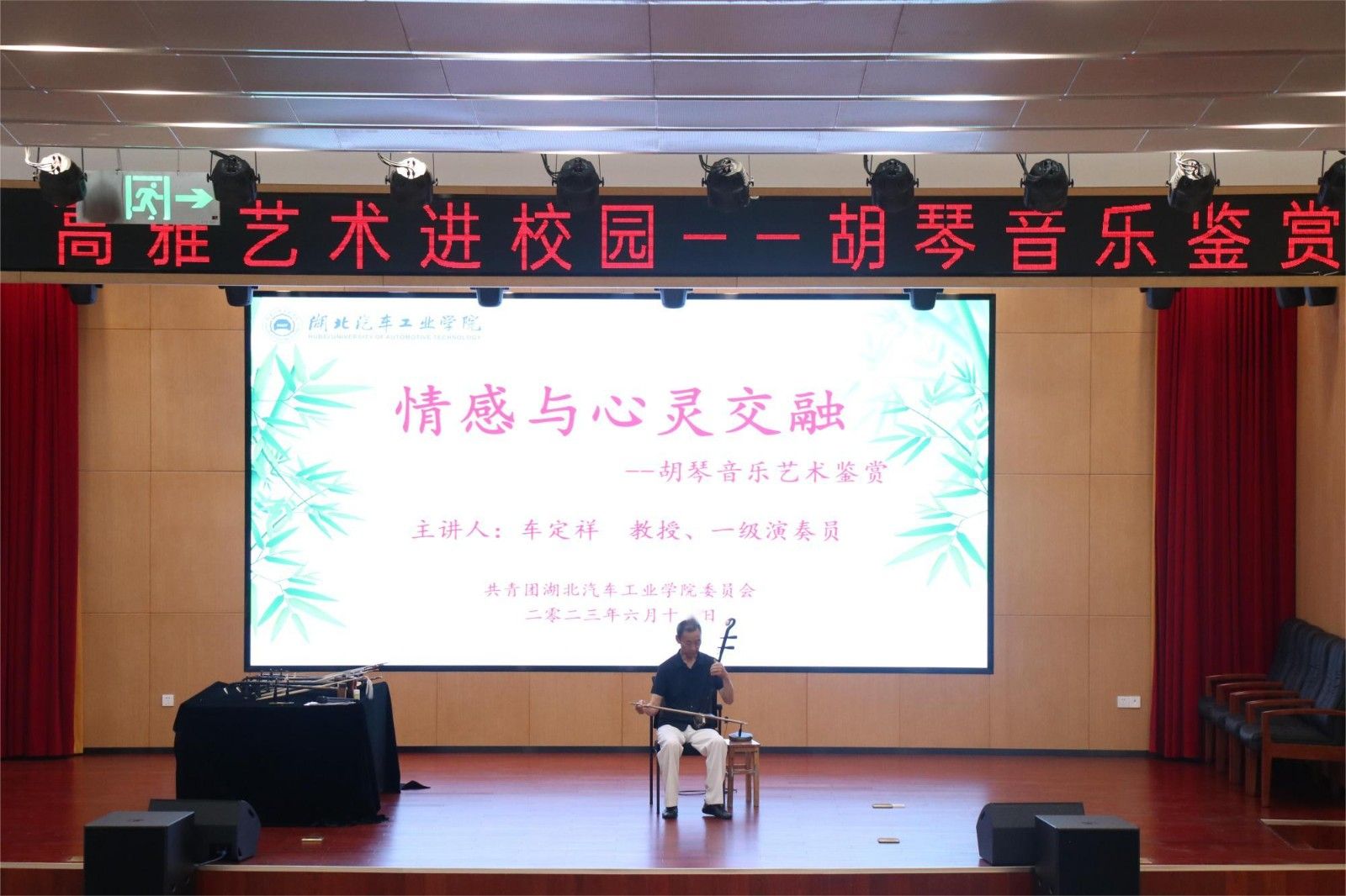 车定祥教授通过对二胡、板胡、高胡、中胡和京胡等不同的胡琴的介绍,向师生们展示了民族乐器的基本常识与独特魅力,在现场演奏《二泉映月》《渔舟唱晚》《梁祝》《梨花颂》《历史的天空》等近二十首大家熟知喜爱的优秀经典曲目,让大家感受到了胡琴音乐的美妙,激发了同学们对民族乐器极大的兴趣。