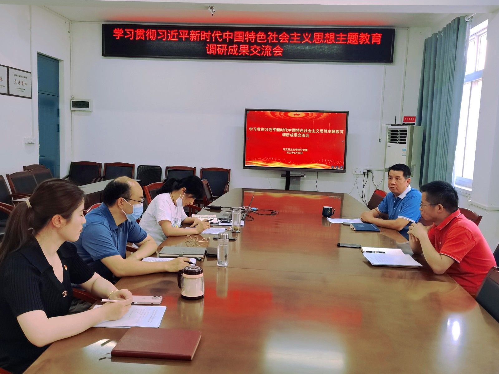 本网讯(文 李童/图 孙永硕)6月25日下午,马克思主义学院分党委在3026会议室召开学习贯彻习近平新时代中国特色社会主义思想主题教育调研成果汇报交流会,研究部署相关工作,分党委领导班子全体参会,会议由分党委书记计毅波主持。