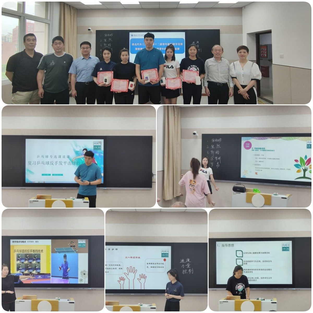 本网讯(文/图 张园)6月27日下午,体育部在1308教室举行青年教师教学大奖赛。大赛由体育部副主任肖鹤主持,5名青年教师参加了此次比赛,学校督导常治斌、教学质量监控与评估中心处长钱洁、教务处副处长周明智、体育部主任熊玲、体育部余超教授和王河镇教授等6人担任此次比赛的评委,体育部全体教师到场观摩。