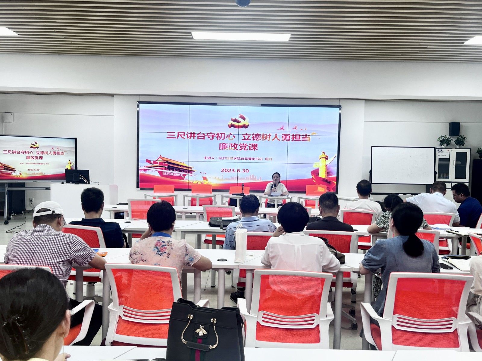 会上,周丹传达了学校6月29日召开的2023年党风廉政建设宣传教育月部署启动会议精神,并以“三尺讲台守初心立德树人勇担当”为主题,从“不忘信仰之心,对教育事业负责任”“不忘敬畏之心,对教师称谓敢于担当”“不忘仁爱之心,对学生关怀备至”三个方面讲授专题廉政党课,结合师德师风警示教育典型案例,教育引导教职工加强学习,以案为鉴,不断提高廉洁自律意识,筑牢廉洁自律思想根基,做讲正气、有情怀的“四有”好老师。