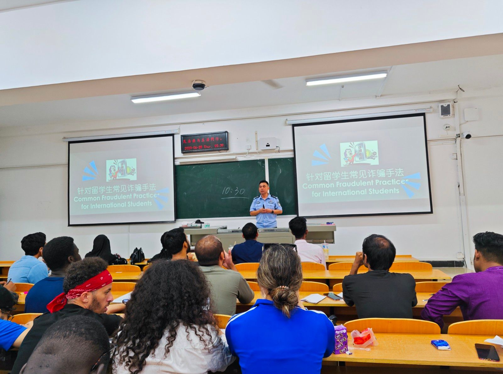 本网讯(文/图 张婷婷)6月29日上午,国际教育学院邀请十堰市公安局东岳分局出入境管理大队和国保大队警官一行入校开展警校联合安全、法律法规讲座及暑假安全班会。