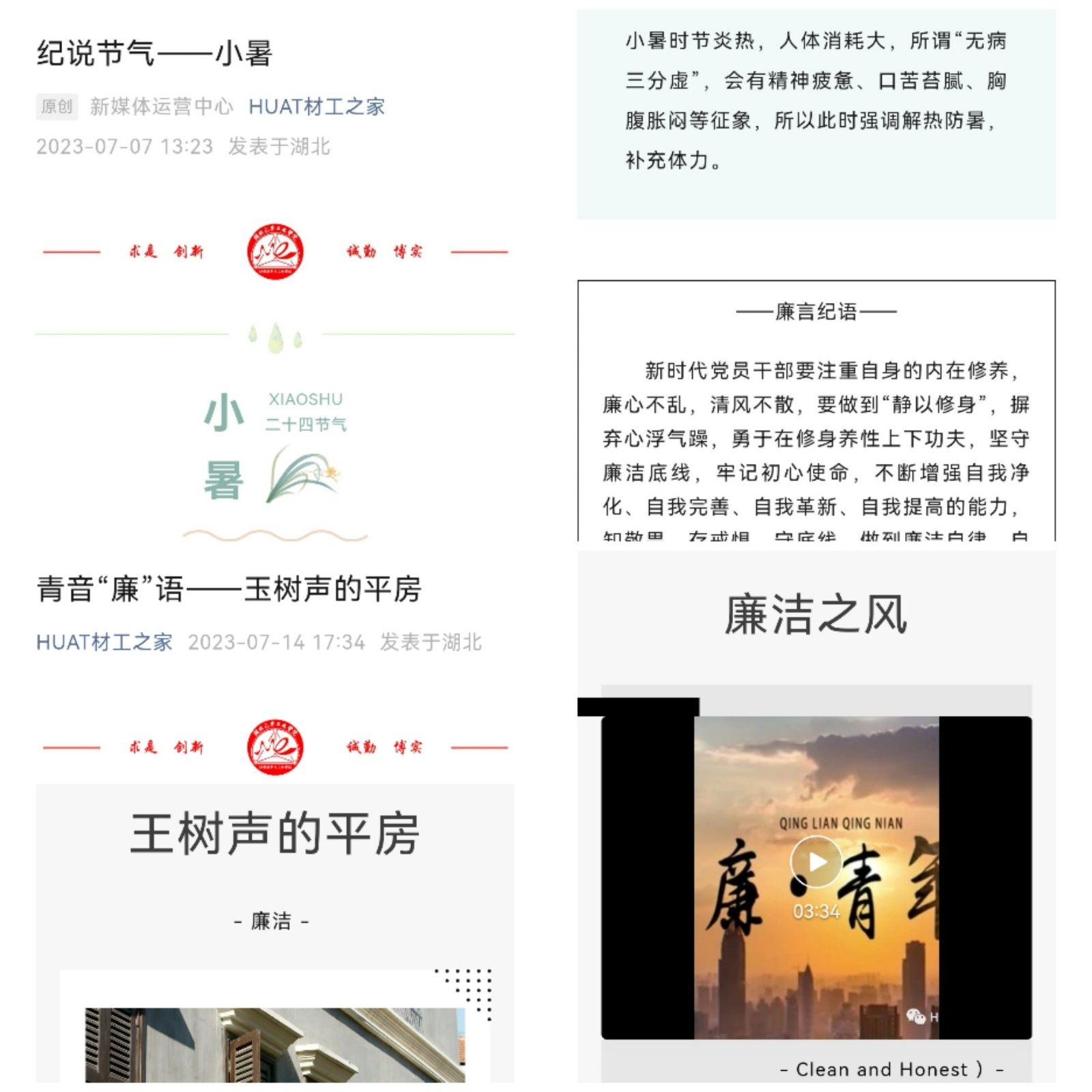 清风细雨“润廉”,强化崇廉素养。在材料学院微信公众号平台推出“青音廉语”、“纪说节气”等专栏,一个又一个廉政故事的讲述,一句又一句节气廉洁的提醒,声情并茂地展现了中华传统文化中的清廉元素,让监督提醒如影随形,潜移默化涵养“不想腐”的自觉。