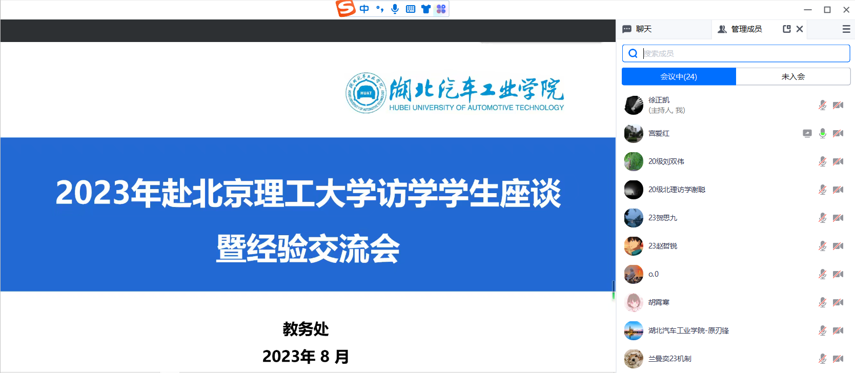 本网讯(文/徐正凯)8月15日上午,学校召开了2023年赴北京理工大学访学学生座谈暨经验交流会(线上),合作发展处、教务处、相关二级学院负责人,2020级访学归来学生代表、2023级全体访学学生参加了本次会议。会议由教务处处长宫爱红主持。