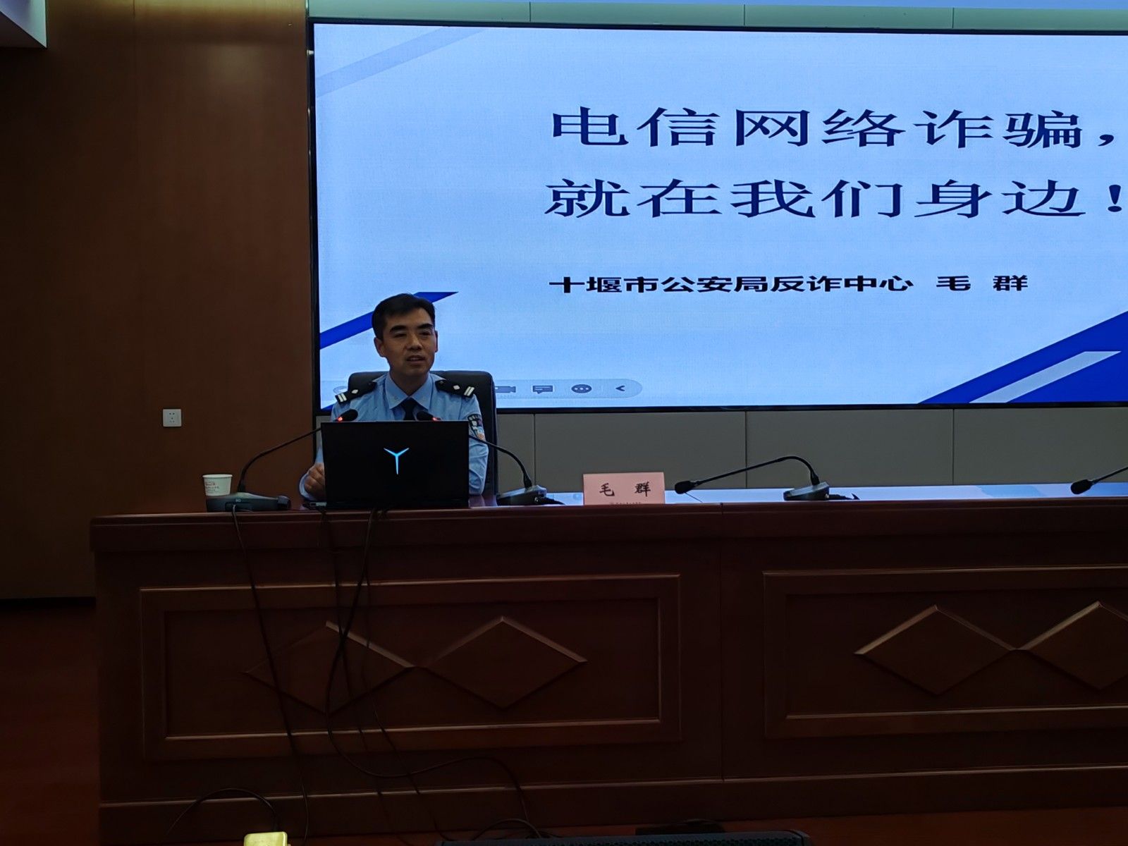 毛群以“电信网络诈骗就在我们身边”为题,从当前电信网络诈骗形势、什么是电信网络诈骗、电信网络诈骗的常见类型及特征、如何防范电信网络诈骗等四个方面,以详实的数据、鲜活的案例、生动的语言,为参会的师生作了一堂精彩的反诈防骗报告。