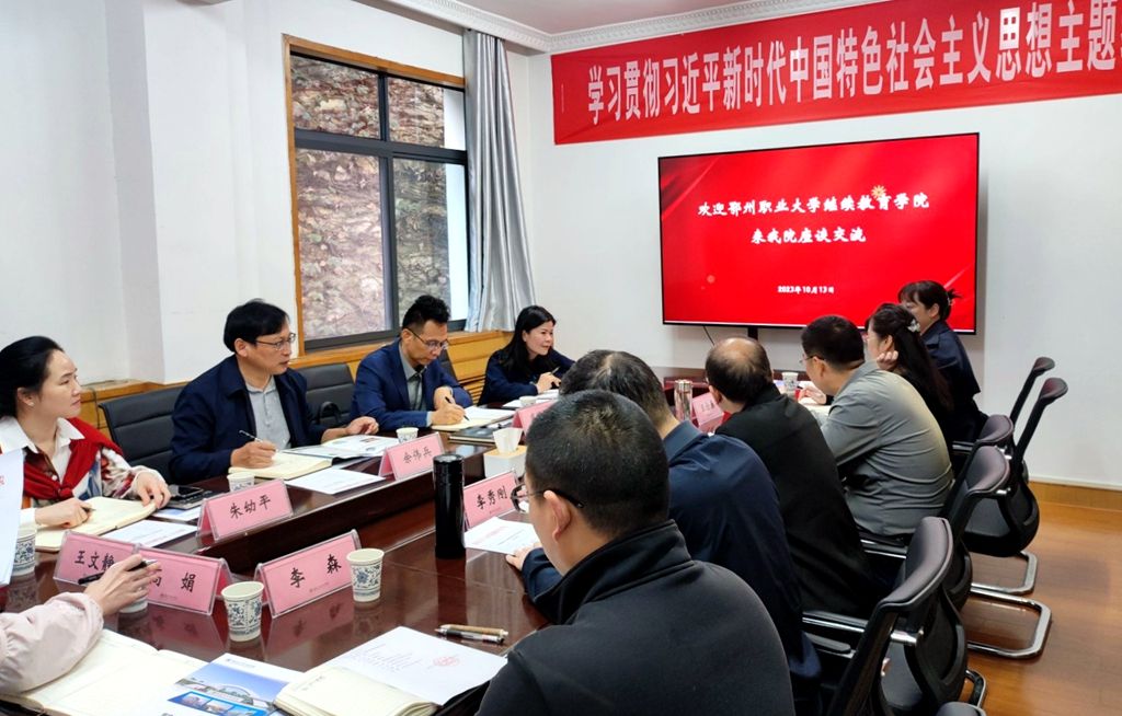 本网讯(文 王文静/图 万小莉)为进一步推进合作,强化沟通,10月13日上午,鄂州职业大学继续教育学院院长盛耀志一行4人来校考察交流。继续教育学院分党委书记苏子波,院长缪勇,副院长王念春、李秀刚及相关科室负责人参加了交流会。