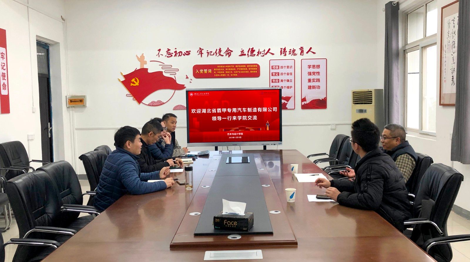本网讯(文 张聪慧、陈智伟/图 何沛然)11月15日上午,湖北省盾甲专用汽车制造有限公司总经理邓文山、总工程师尚宏伟一行来我院开展校企合作交流。艺术与设计学院副院长龚青山、朱炜,工业设计系教师赵佳瑞、陈智伟参加交流活动。会议由副院长龚青山主持。