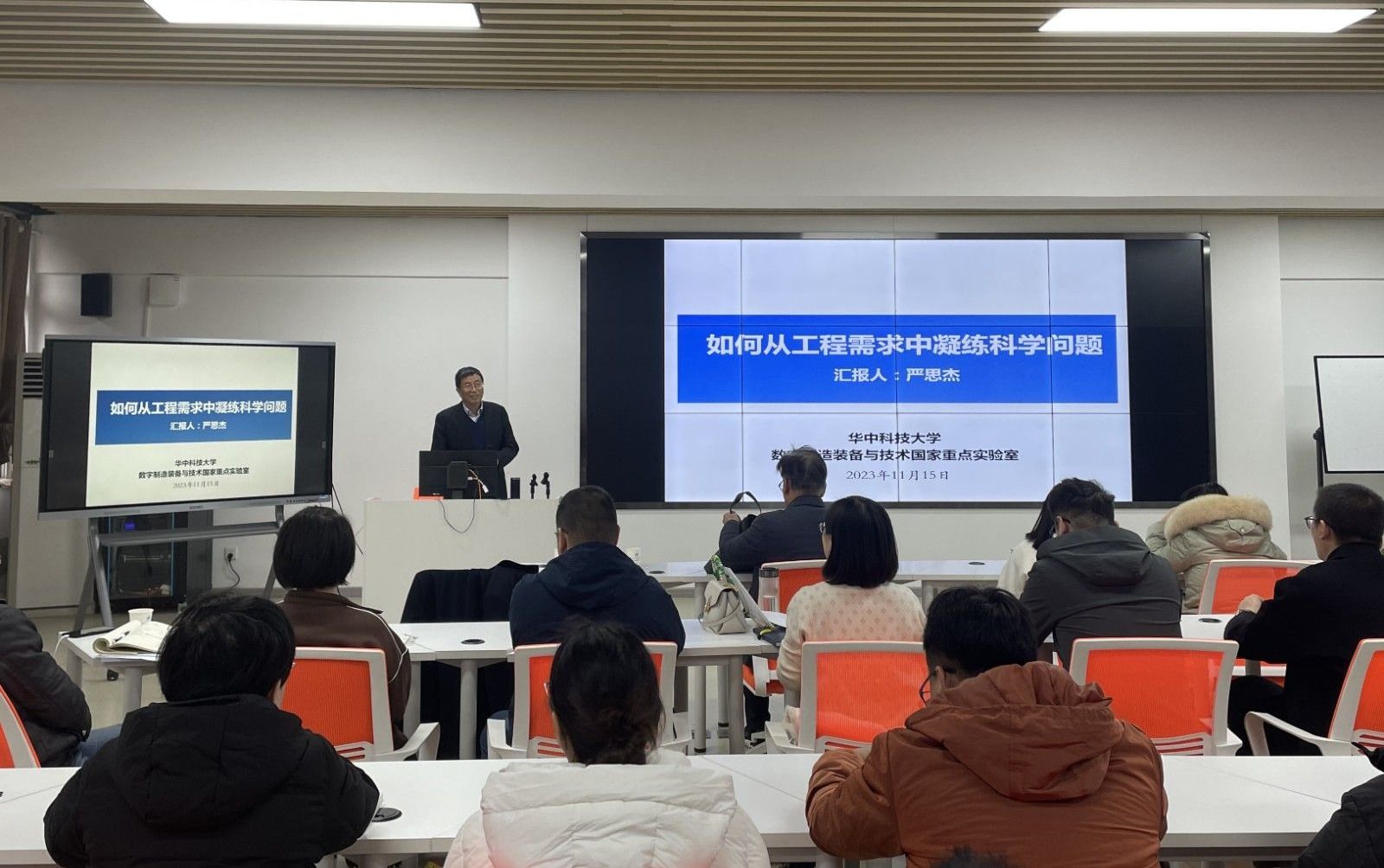 本网讯(文/图 周珺杰)11月15日下午,华中科技大学严思杰教授应邀做客我校“东风讲坛”第一百二十讲,为师生做“如何从工程需求提炼科学问题”主旨报告。来自学校各个学院60余名青年博士、教师及研究生参与了此次报告,报告会由机械工程学院院长王保华主持。