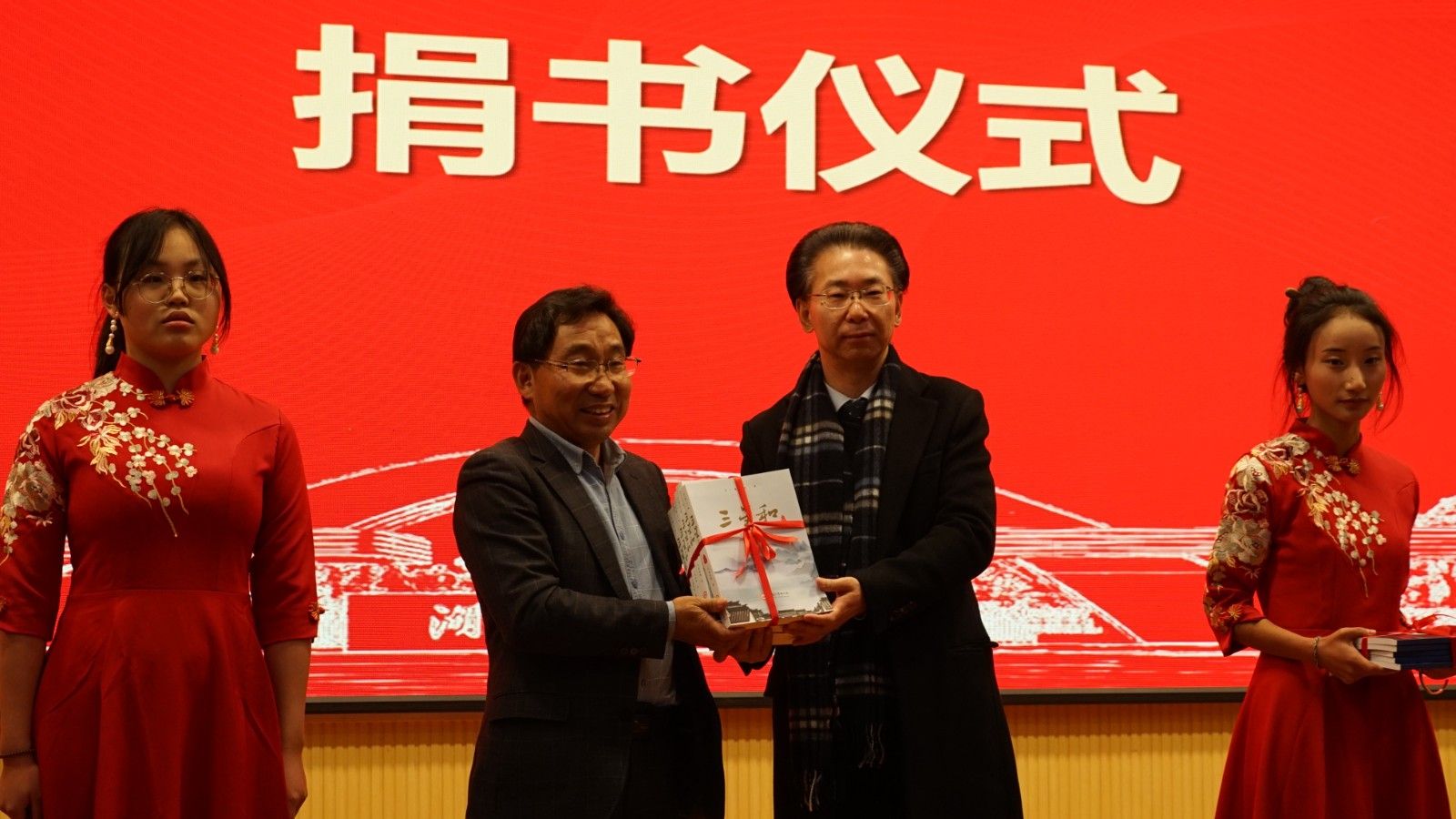 在师生欢聚喜悦之际,黄承林校友向学校捐赠其精心撰写创作的《三星和》《这辈子我属蛇》《隔离60天》等100余本图书,图书馆党支部书记陈战锋代表学校接受捐赠,并对黄承林先生的慷慨捐赠表示衷心感谢。