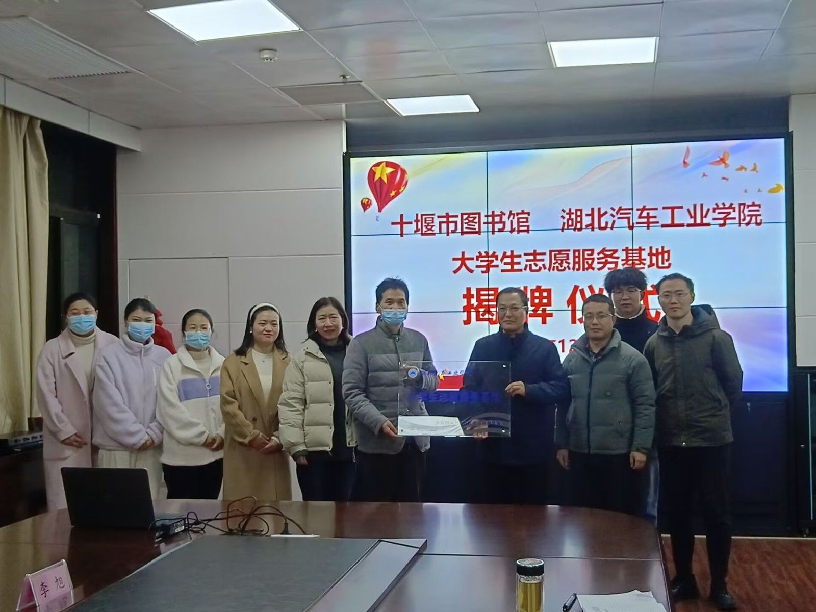 本网讯(文 李旭/图 度焕涛)12月5日是“国际志愿者日”,湖北汽车工业学院、十堰市图书馆共建“湖北汽车工业学院大学生志愿服务基地”揭牌仪式在市图书馆会议室举行。校团委书记杜祥军、团委副书记焦建杰、团委实践与社团工作部副主任李旭及2名学生志愿者代表一行5人参加了揭牌仪式。
