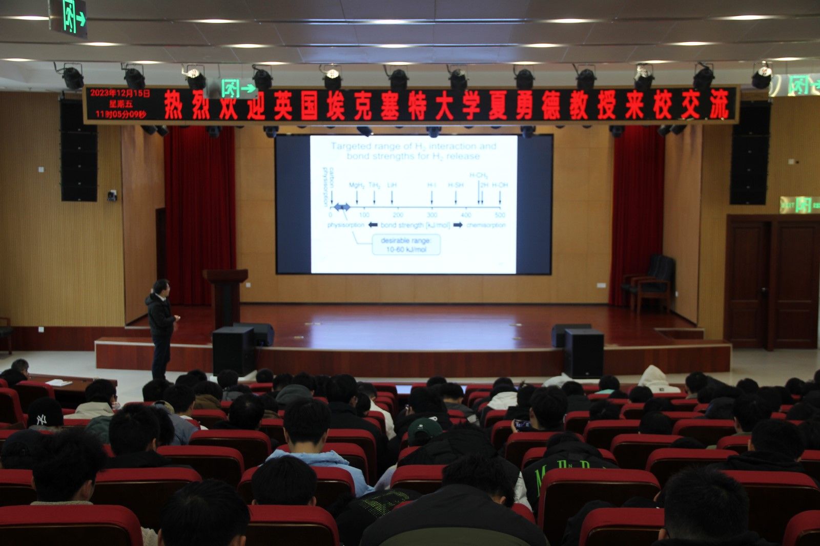 在产教大楼三楼报告厅,夏勇德博士作了题为“多孔碳基材料在能源方面的应用”的报告。报告由数理与光电工程学院院长李建主持。