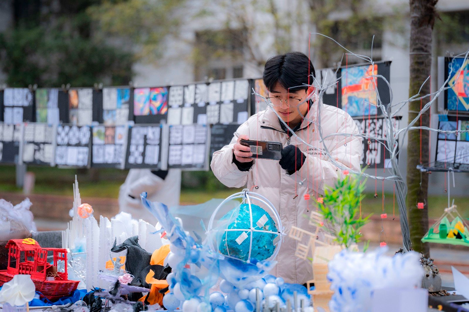 本网讯(文 刘仁君/图 苏泰镊)12月18日艺术与设计学院在东风学子园成功举办以“中国精神”为主题的美育成果暨造型设计基础课程作品展。参展的是22级《造型设计基础》课程全体学生作品,包括立体构成作品160余件,色彩与平面构成作品300余幅。