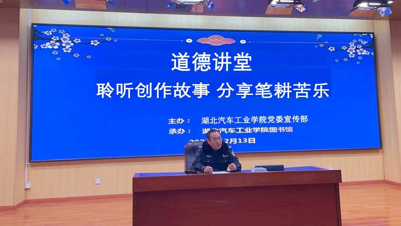 本网讯(文/李晶晶 图/高歌)12月13日下午,图书馆在报告厅举行“聆听创作故事 分享笔耕苦乐”第四期道德讲堂活动。150余名十堰市图书馆干部职工、市公安交管局四大队交警、学校师生代表参加了本次活动。