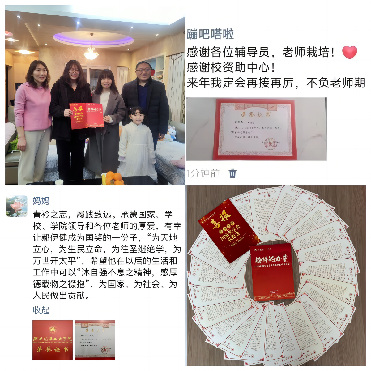 为了让家长了解孩子的学习生活情况,向家长传达获奖同学在校优秀事迹,同时向家长和获奖同学表示祝贺,学工部还专门制作了国家奖学金获得者优秀事迹汇编《榜样的力量》,国家奖学金喜报、励志奖学金证书等,通过家访的渠道送至家长手中。