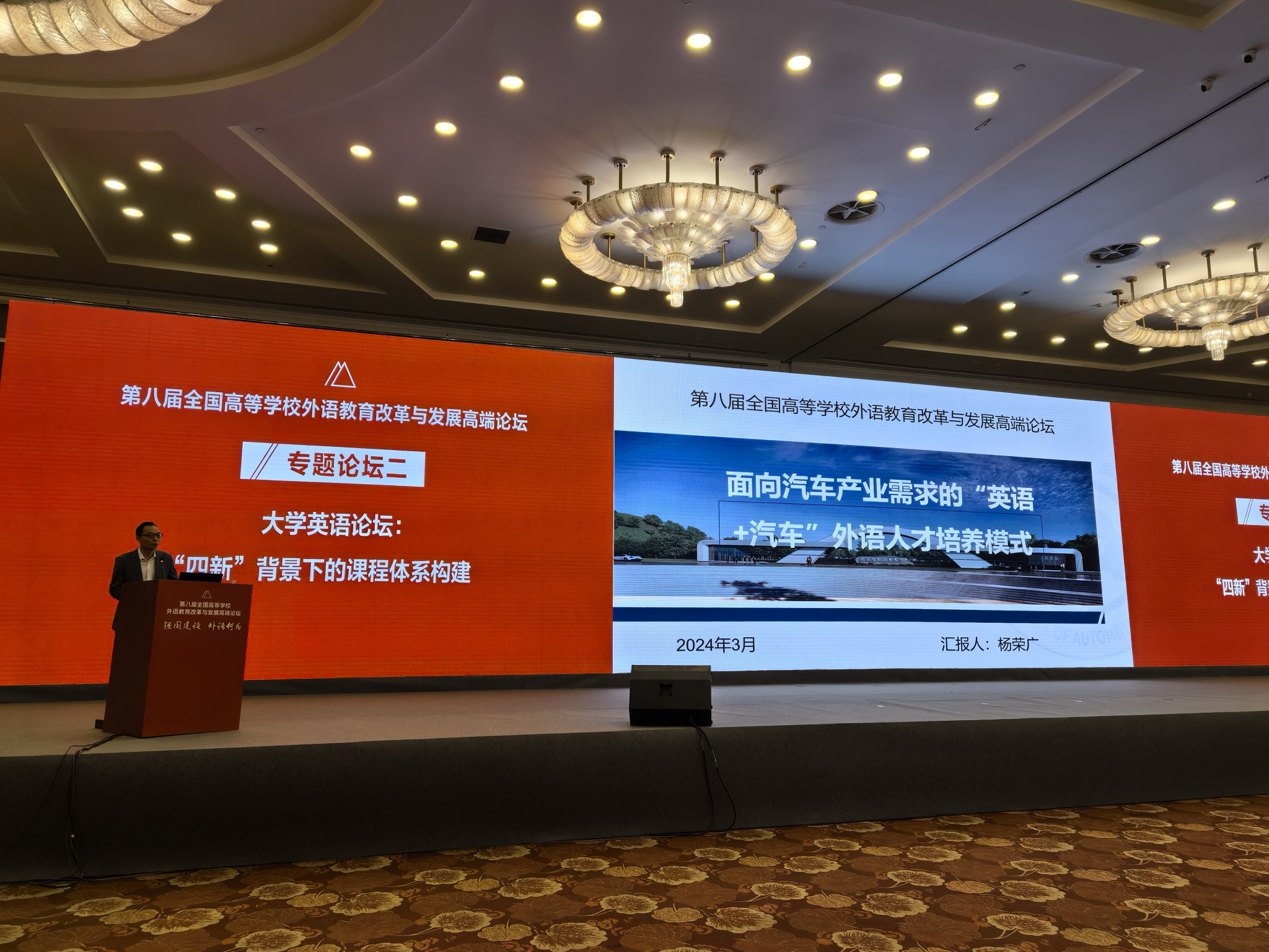 本网讯(文/图 朱丽)3月23日,第八届全国高等学校外语教育改革与发展高端论坛在北京召开。我校外国语学院教师杨荣广应邀参加研讨会,并做“面向汽车产业需求的‘英语+汽车’外语人才培养模式”主题报告。