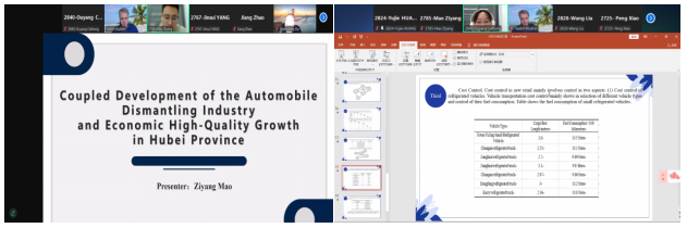 会上,我校研究生毛子阳作了题为“Coupled Development of the Automobile Dismantling Industry and Economic High-Quality Growth in Hubei Province”的报告。该报告通过分析湖北省汽车拆解产业与经济高质量增长的动态耦合机制,提出了促进产业升级和循环经济的策略。研究生欧阳彩虹作了题为“Optimization Analysis of Cold Chain Logistics Distribution for Fresh Agricultural Products under the New Retail Background”的报告。该报告针对新零售背景下农产品冷链物流配送的优化问题,提出了创新的优化模型和算法,旨在提升农产品供应链的效率和降低物流成本。