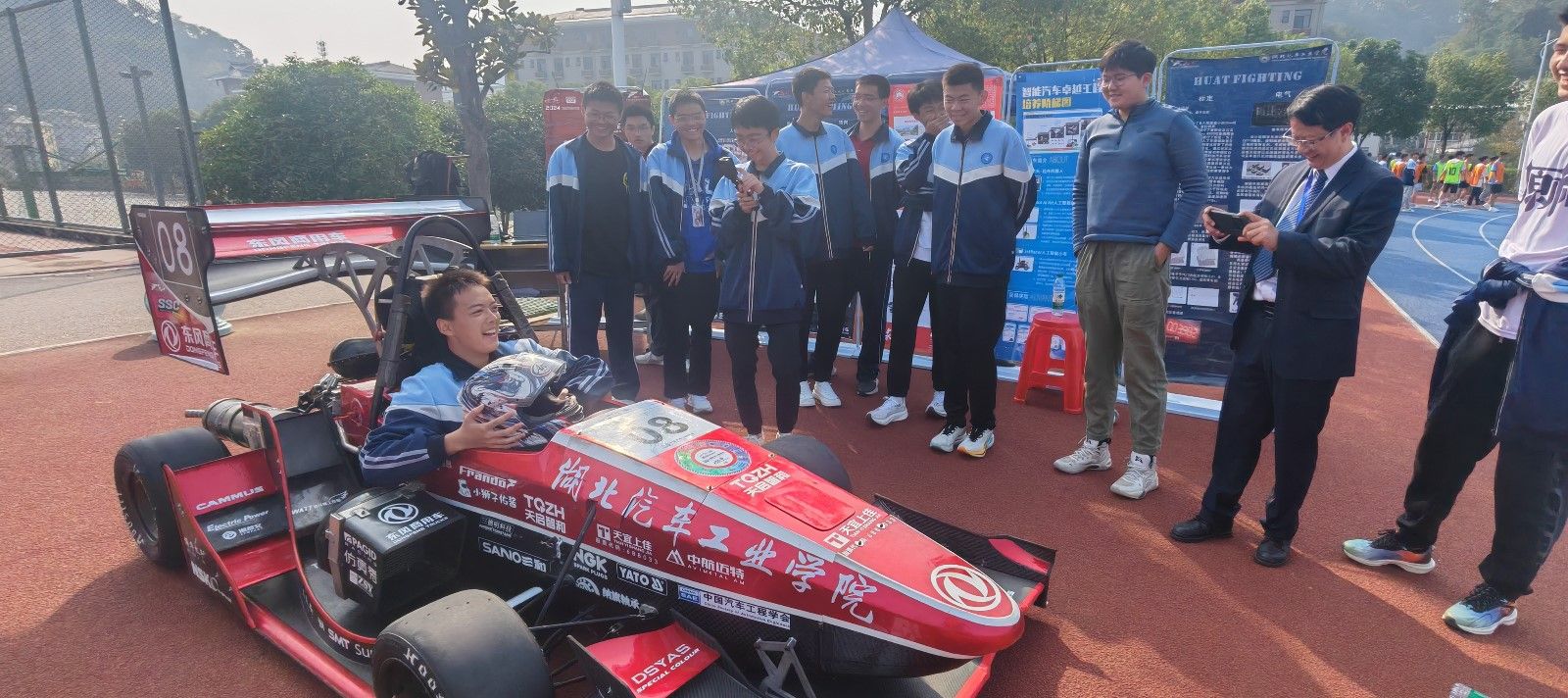 伴随着一声响彻全场的轰鸣,红色流线型方程式赛车疾驰而出,如同一道闪电划过赛道,酷炫的车身、惊人的速度与力量,瞬间点燃了全场师生的热情!