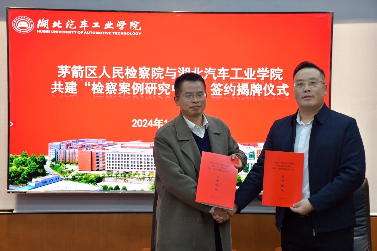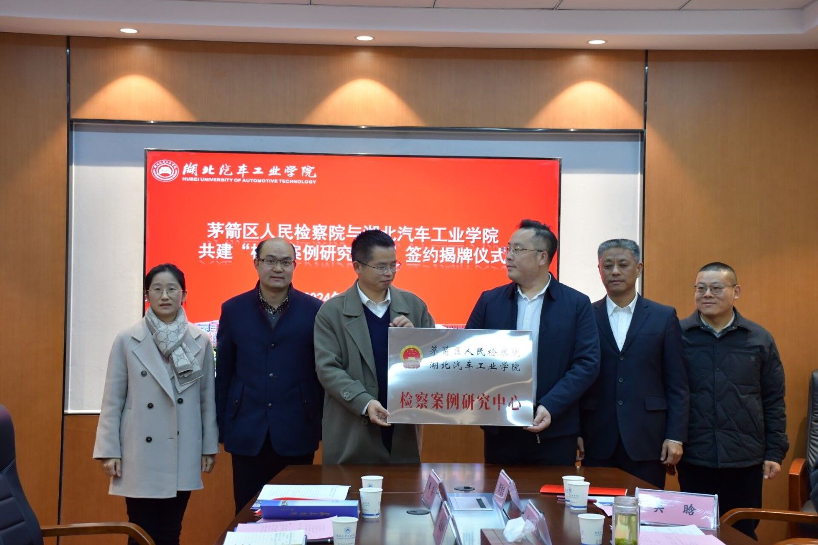 本网讯(文 郑实/图 张俊威)11月28日下午,我校与茅箭区人民检察院检校共建“检察案例研究中心”签约暨揭牌仪式在产教大楼三楼多功能会议室举行。茅箭区检察院党组书记、检察长查孟达,党组副书记、副检察长吕丹等领导及部门负责人,我校人文学院院长黄永昌、副院长成继平、副院长安军、法学系主任陈来宏、法学系专业负责人景勤及部分法学专业教师参加了仪式。签约暨揭牌仪式由安军主持。