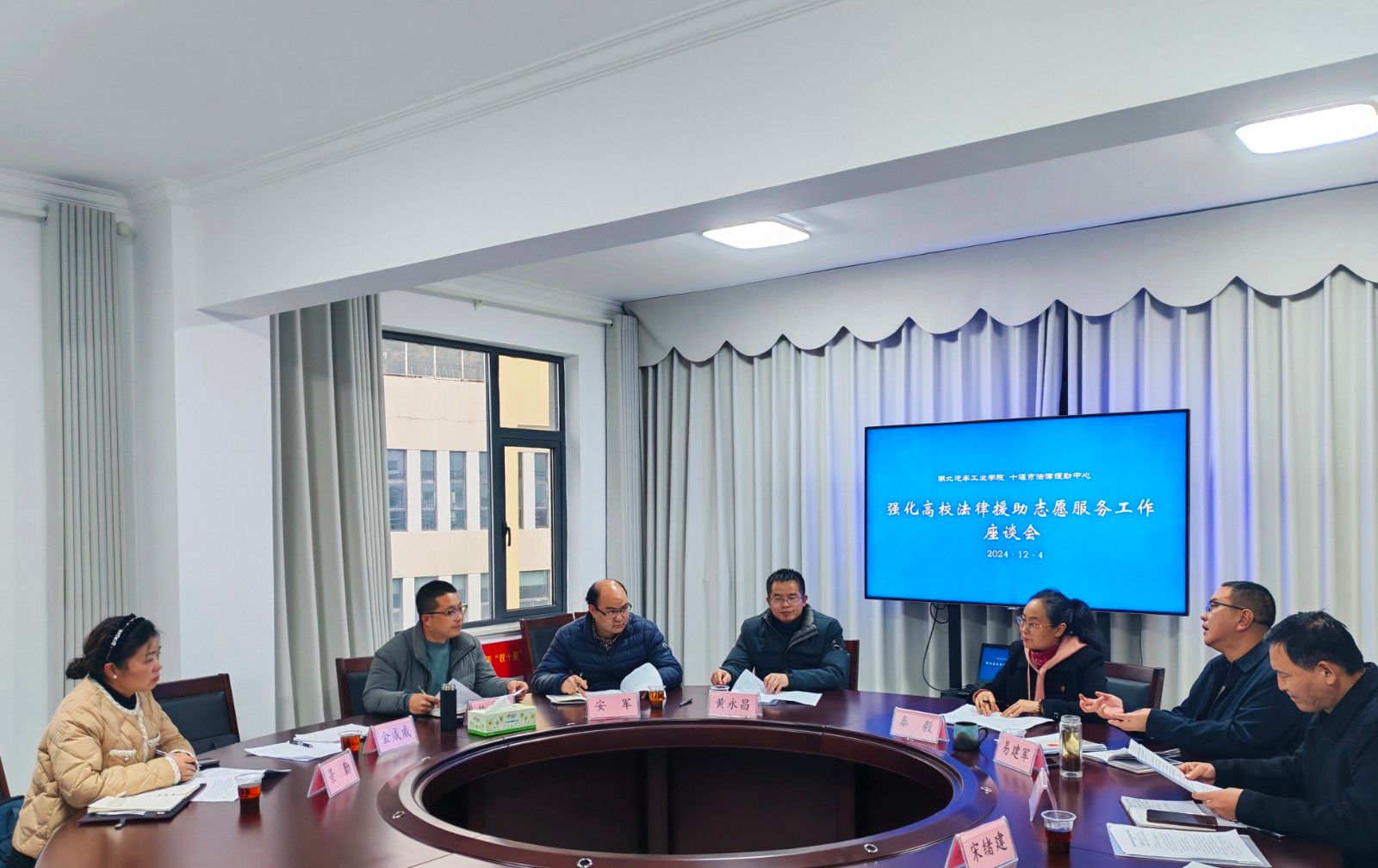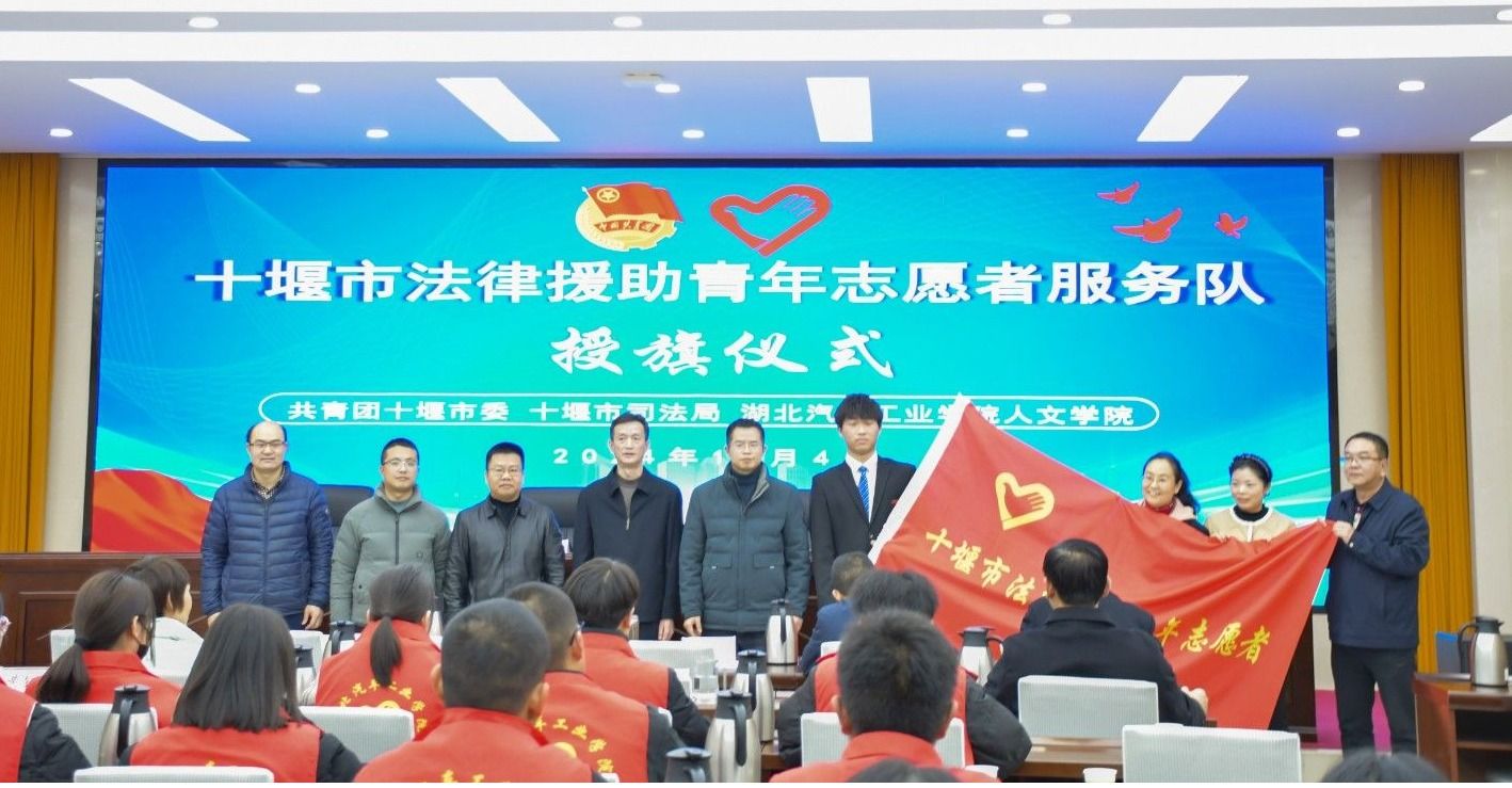 本网讯(文/图 黄钰雯、吴鑫、樊书语)为推动法律援助志愿服务与法学教育双融双促,提升法治人才培养质量,12月4日下午,“十堰市法律援助青年志愿者服务队”授旗仪式在市司法局举行。团市委副书记辛文波,市司法局党组成员、副局长喻强,市法律援助中心主任秦毅、支部书记易建军,我校人文学院院长黄永昌、副院长安军、校团委副书记焦建杰以及施洋法律服务团、施洋班师生代表20余人参加授旗仪式。