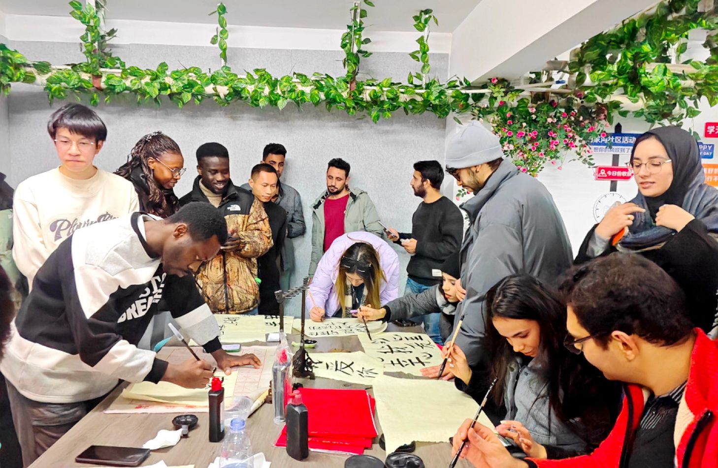 本次活动还设置了传统文化体验区,我校书法协会的学生志愿者们主动为留学生们讲解春联文化,并教他们如何写春联,外籍师生们纷纷驻足观看,并亲身体验了写春联的乐趣,表示要将其贴在宿舍门上迎接新年的到来。