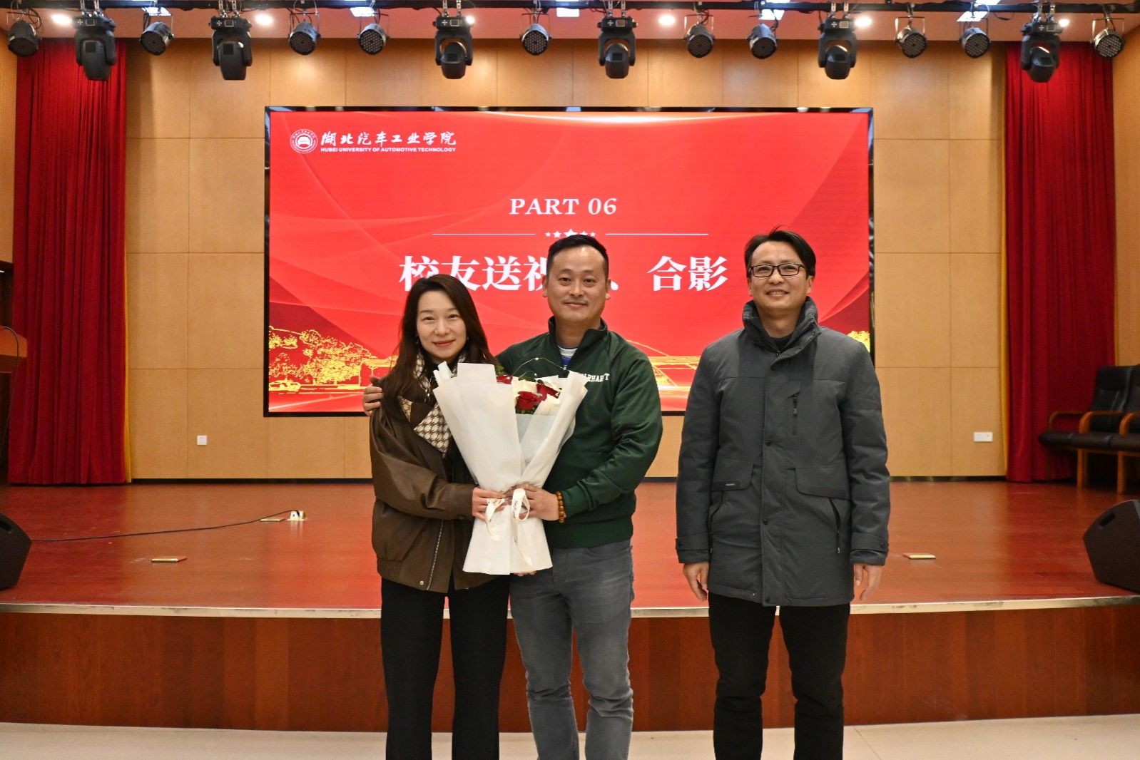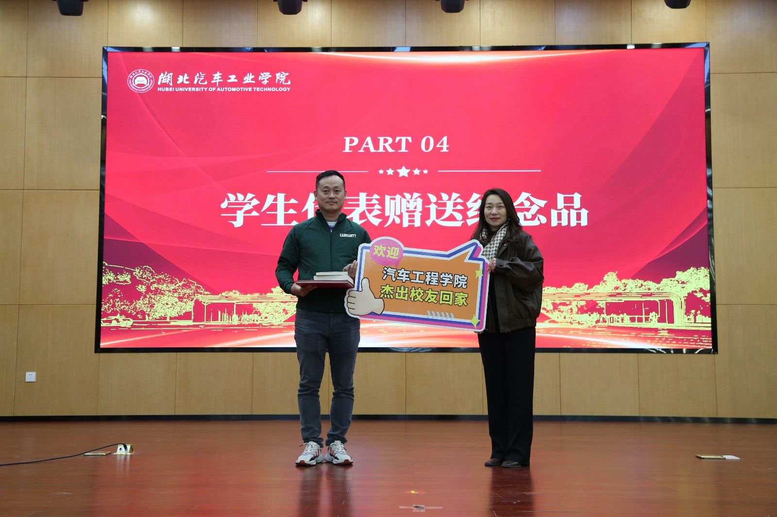 在得知报告会当天也是吴必权先生与夫人郝娟女士14周年结婚纪念日后,学工部长王关锋为两位在汽院结缘、共同支持、互相成就的校友伉俪送上衷心的祝福和鲜花,嘱托两位校友一如既往的关注支持母校,常回母校看看,为母校的发展建言献策,共同见证湖北汽车工业学院更加美好的明天。学生代表李函还为优秀学长送上学校校徽等纪念品。