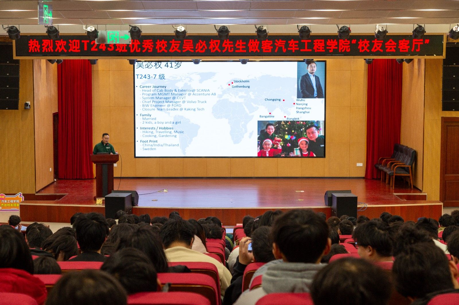 本网讯(文 张倍、曹闪闪/图 宋春成)为深入挖掘校友资源,进一步发挥优秀校友榜样引领作用,引导在校学生明确奋斗目标,做好大学和职业生涯规划,12月22日,汽车工程学院在产教大楼四楼报告厅举行第四期“校友会客厅”活动,本次活动特邀到学院T2级级优秀校友、瑞典斯堪尼亚重型卡车车身外饰部部长吴必权先生到会,并以“敢于尝试、勇于挑战”为题做经验交流分享。其夫人郝娟、汽车工程学院T3级优秀校友、沃尔沃卡车驻中国大客户经理陪同出席。学工部部长王关锋、副部长杜昕俊,汽车工程学院全体辅导员及300余名学生代表共同参加报告会,活动由汽车工程学院分党委副书记周彬主持。