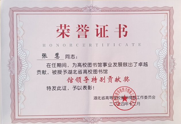 本网讯(文/图 徐常燕)近日,省高等学校图书情报工作委员会公布了第三届“馆领导特别贡献奖”评选结果,我校图书馆(档案馆校史馆)馆长张慧获评湖北省高等学校图书馆2024年度“馆领导特别贡献奖”。
