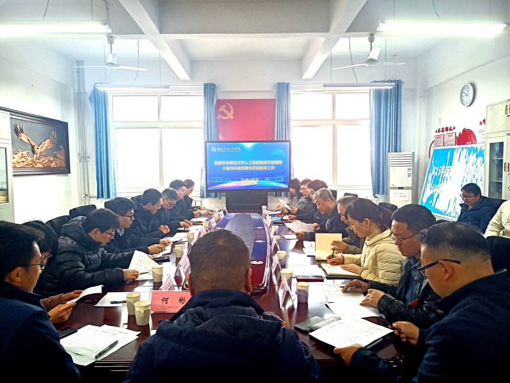 本网讯(文 郭琳/图 于恩淼)1月21日,华中师范大学人工智能教育学部副院长童名文一行,十堰市科技局党组成员、副局长肖克江一行来校调研交流。校学术委员会主任简炜教授、科学技术发展研究院副院长熊永臣、人工智能学院领导班子及骨干教师参加座谈会。会议由人工智能学院院长黄海波主持。