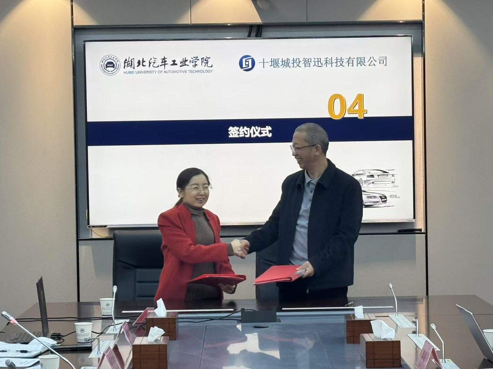 本网讯(文/陈秋林)2月18日上午,在产教大楼三楼会议室,我校与十堰城投智迅科技有限公司共同举行了智慧交通联合研究院共建协议签约仪式。十堰城投智迅科技有限公司副总经理及负责人魏刚、副总经理张振宇、湖北宜居科技有限公司副总经理梁亮、湖北汽车工业学院科学发展研究院院长张元好、智能网联汽车学院院长陈宇峰参加此次签约仪式。会议由智能网联汽车学院副院长吴文欢主持。