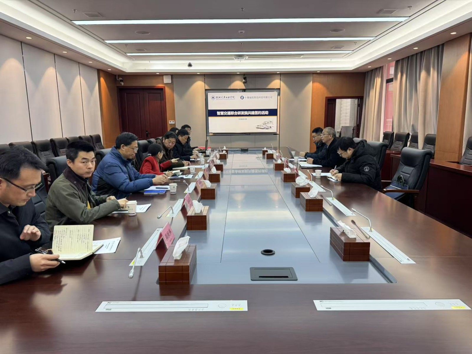 张元好在致辞中介绍了学校在交通领域的深厚底蕴与科研成果。魏刚表达了对合作的期待与信心。双方还回顾了前期在智慧交通领域的合作成果,并正式举行了签约仪式。这标志着智慧交通联合研究院的正式启动。随后,与会人员围绕智慧交通的未来发展及科研合作展开了深入探讨。