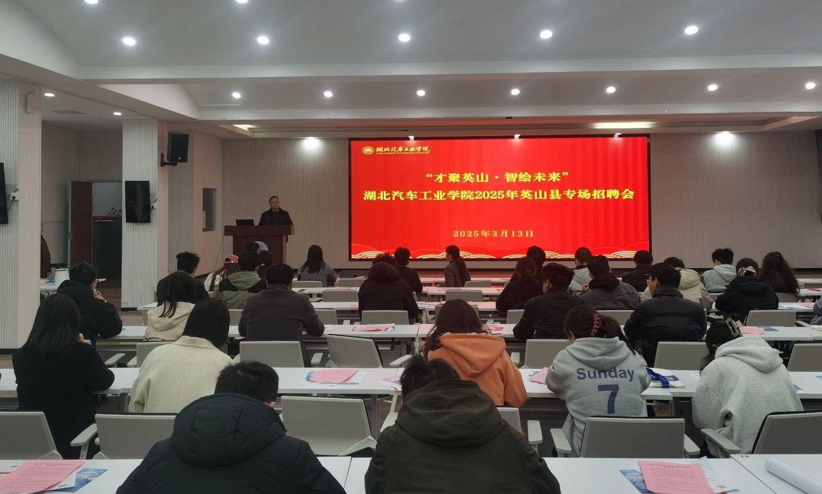 本网讯(文/叶珍)3月13日上午,由我校联合英山县共同举办的“才聚英山·智绘未来”湖北汽车工业学院2025年英山县专场招聘活动在5101报告厅成功举行。这是继去年10月到校开展招聘活动后,英山县再次组团来校招聘。黄冈市人社局、英山县人社局、英山县公共就业服务中心领导参加招聘活动。