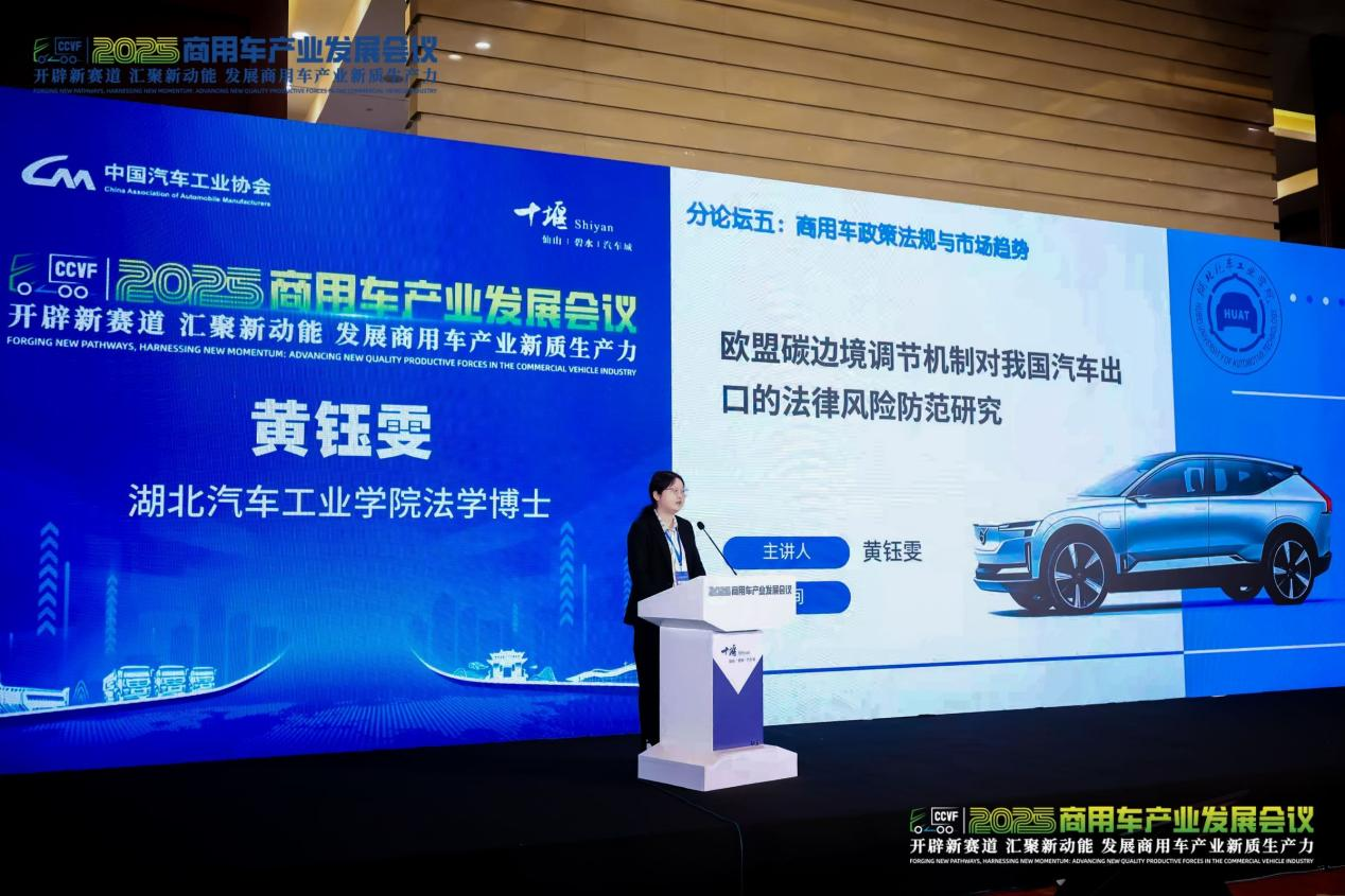 凭借在汽车产业政策法规研究领域的突出成果,我校法学院青年教师黄钰雯博士受邀参会,并在“商用车政策法规与市场趋势”主题分会场,作了题为“欧盟碳边境调节机制对我国汽车出口的法律风险防范研究”的报告。在报告中,黄钰雯通过对欧盟碳边境调节机制(CBAM)深入的调研,向与会者系统展示了该机制的最新政策动态,并运用详实的数据与案例,细致分析了这一机制给我国汽车出口企业带来的潜在法律风险和挑战。为应对这些风险,黄钰雯从企业微观层面的战略调整、行业协会的统筹协调,到国家层面的政策引导,提出了全方位的应对策略。