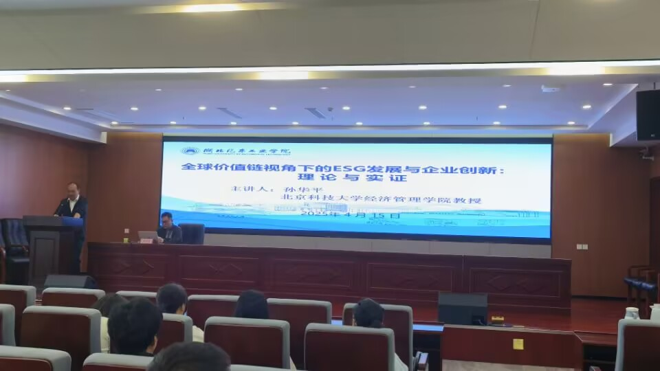 本网讯(文 鲍建新/图 董海燕)4月15日上午,北京科技大学经济管理学院孙华平教授应邀主讲湖北汽车工业学院东风讲坛,以“全球价值链视角下的ESG发展与企业创新:理论与实证”为题,为汽车商学院师生带来一场学术盛宴。讲座在产教楼3楼报告厅举行,由汽车商学院副院长鄢曹政主持,学院新进博士、青年教师和全体研究生参加讲座。