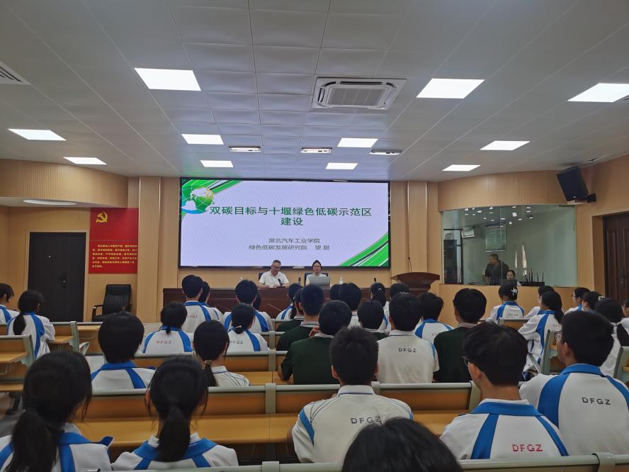 本网讯(文/卓安翼)5月26日上午,东风高级中学五楼演播厅座无虚席,湖北汽车工业学院汽车商学院望甜博士受邀为70余名师生带来题为“双碳目标与十堰绿色低碳发展”的专题讲座。本次讲座旨在普及“碳达峰、碳中和”知识,增强师生环保意识,推动绿色校园建设。