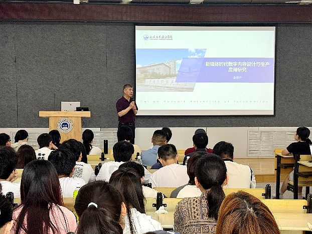 李济宁聚焦视觉传达、影视制作等领域,以“新媒体环境下数字内容设计与生产”为主题,从AI技术对创作流程的变革切入,剖析数字内容创作的机遇与挑战,强调创作者需把握内容策划、技术手段与用户体验的协同关系。他展示了短视频、动态图形、品牌传播等多类优秀学生作品,其新颖形式与技术融合实践获师生好评。