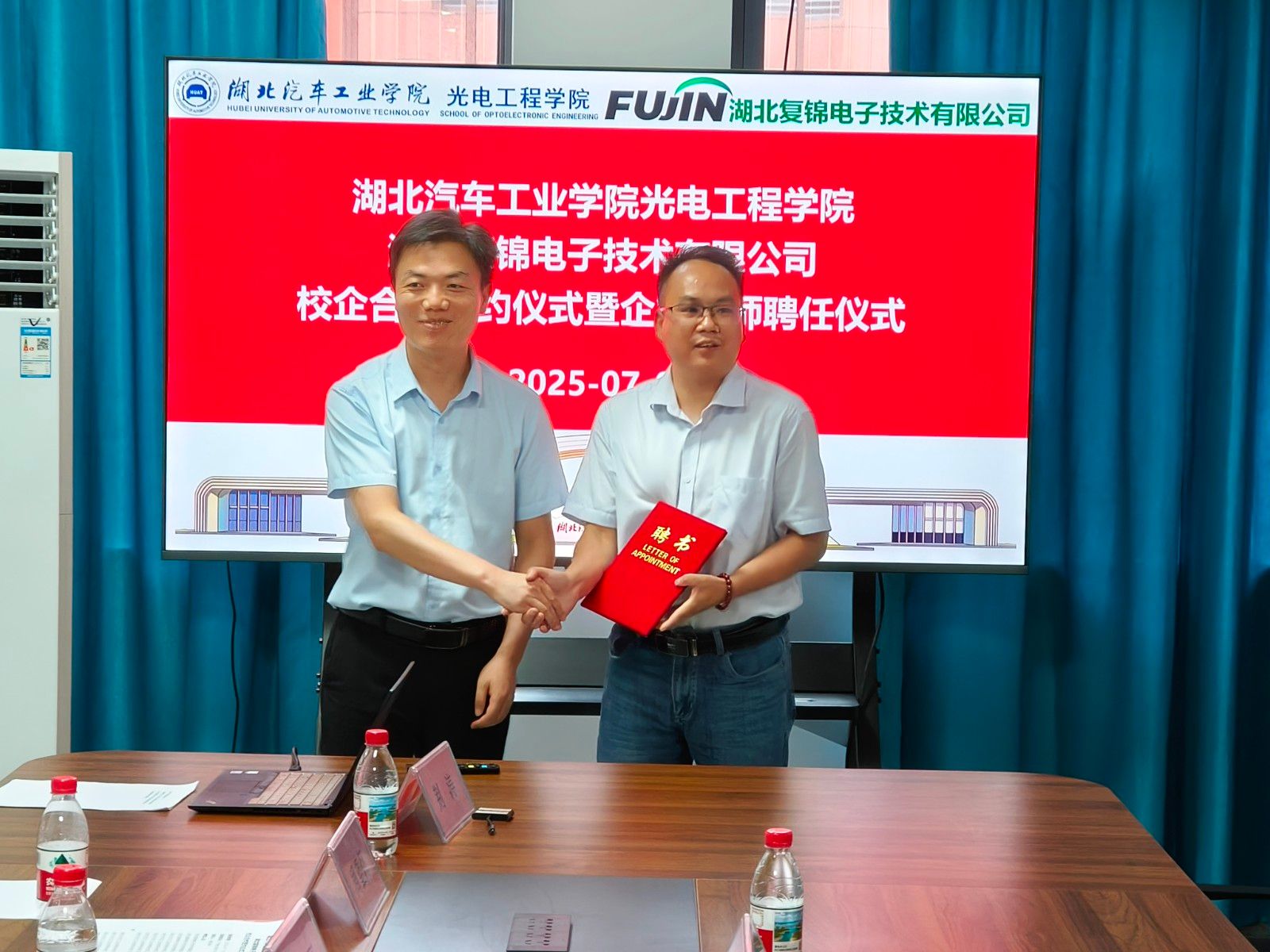 本网讯(文/赖魏)7月2日下午,湖北复锦电子技术有限公司总经理张波一行莅临我校参加校企合作协议签约仪式暨企业导师聘任仪式。公司人事经理宋俊君,业务助理陈骊隍随行。光电工程学院、新能源学院院长熊永臣、院长助理曹名磊和微电子系教师代表共同参加了此次仪式。