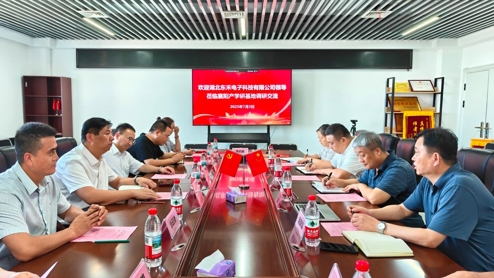 本网讯(文 薛凌芸/图 姚舒航)7月3日下午,学校与湖北东禾电子科技有限公司校企联合共建“专家工作站”签约仪式在襄阳产学研基地604会议室举行。学校学术委员会主任简炜教授,襄阳产学研基地党委书记、主任赵新军,湖北东禾电子科技有限公司总经理王桥彬等参加了签约仪式。