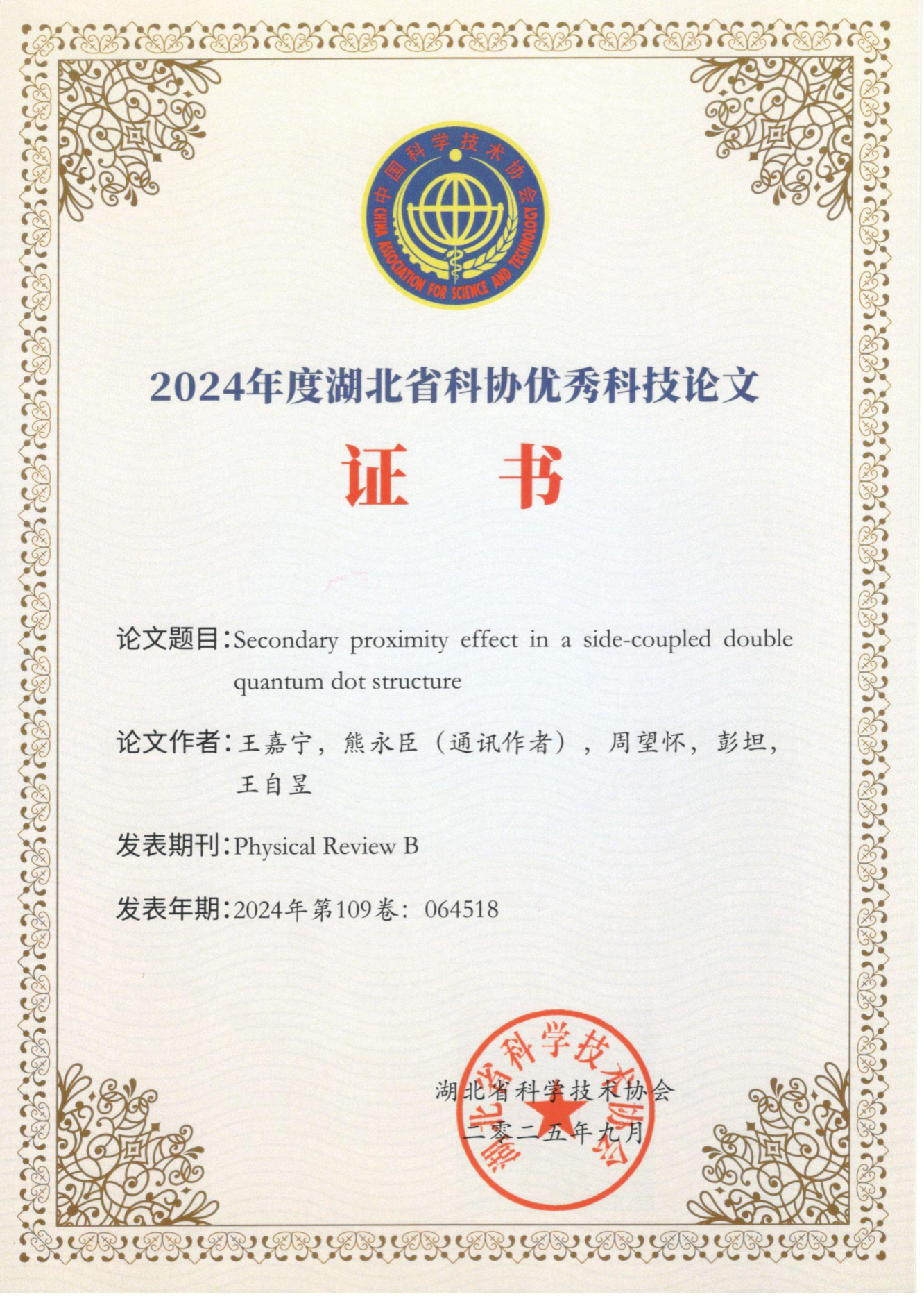 本网讯(文/彭坦)近日,湖北省科学技术协会公布了“2024年度湖北省科协百篇优秀科技论文”名单,我校光电工程学院、新能源学院、汽车未来技术学院微纳结构与量子器件团队2024年2月发表于凝聚态物理顶级期刊Physical Review B的论文“Secondary proximity effect in a side-coupled double quantum dot structure”成功入选。论文第一作者为我校光学工程专业2021级硕士研究生王嘉宁(现为安徽大学在读博士研究生),通讯作者为团队负责人熊永臣教授及相关校外合作者。研究成员还包括团队周望怀副教授和彭坦博士,我校为第一通讯单位。