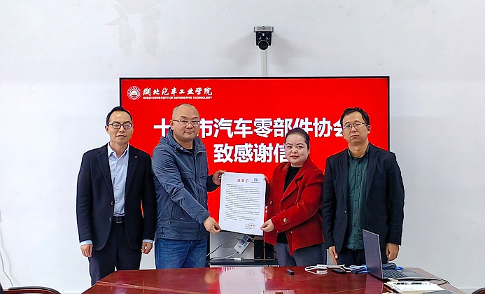 本报讯(文/图 龚建强)10月29日下午,十堰市汽车零部件行业协会秘书长宁攀一行赴外语外贸学院,开展校企合作洽谈并送上感谢信,致谢学院五名师生在2025上海华墨国际汽配展期间的优质服务。