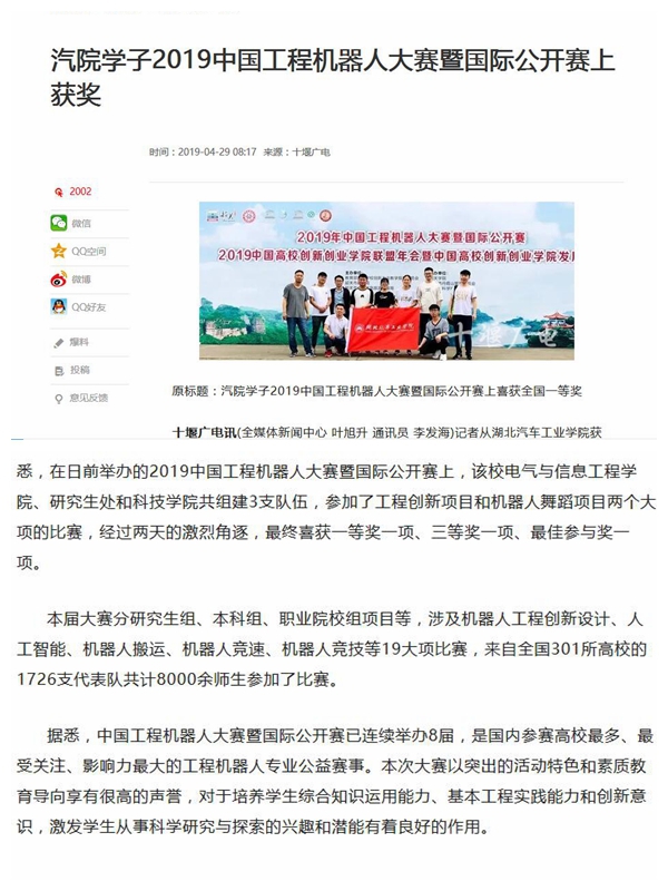 【十堰广电】汽院学子2019中国工程机器人大赛暨国际公开赛上获奖