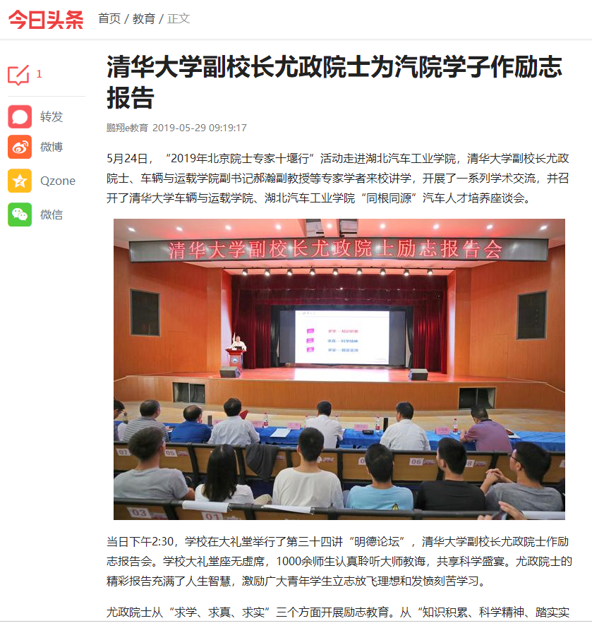 【今日头条】清华大学副校长尤政院士为汽院学子作励志报告