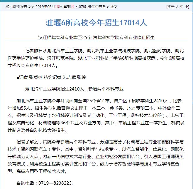 【十堰晚报】湖北汽车工业学院招生2410人,新增两个本科专业