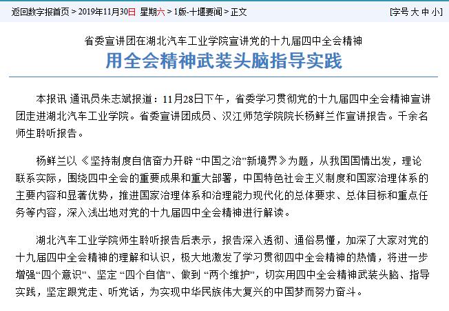 【十堰日报】省委宣讲团在湖北汽车工业学院宣讲党的十九届四中全会精神