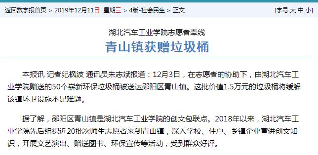 【十堰日报】湖北汽车工业学院志愿者牵线 青山镇获赠垃圾桶