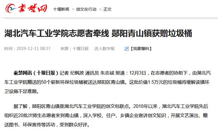 【秦楚网】湖北汽车工业学院志愿者牵线 郧阳青山镇获赠垃圾桶