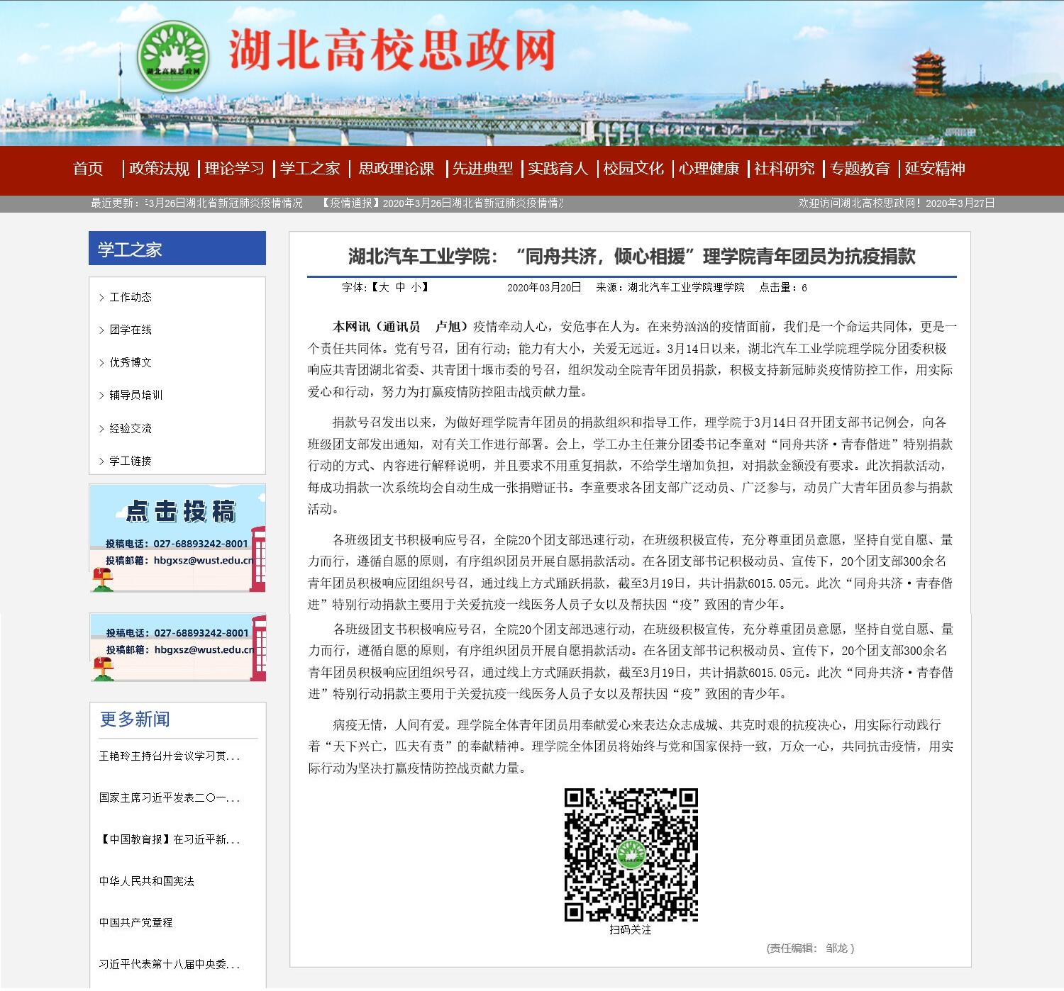 【湖北高校思政网】湖北汽车工业学院:“同舟共济,倾心相援”理学院青年团员为抗疫捐款