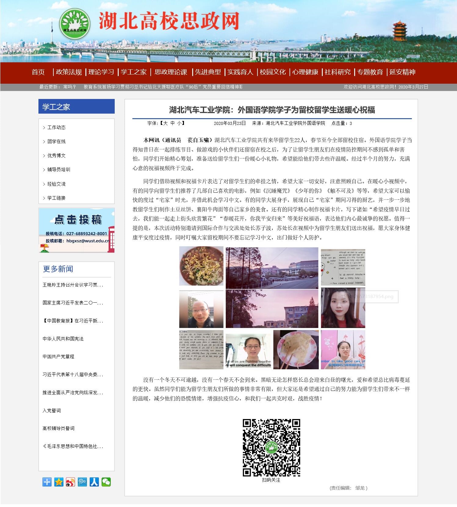 【湖北高校思政网】湖北汽车工业学院:外国语学院学子为留校留学生送暖心祝福
